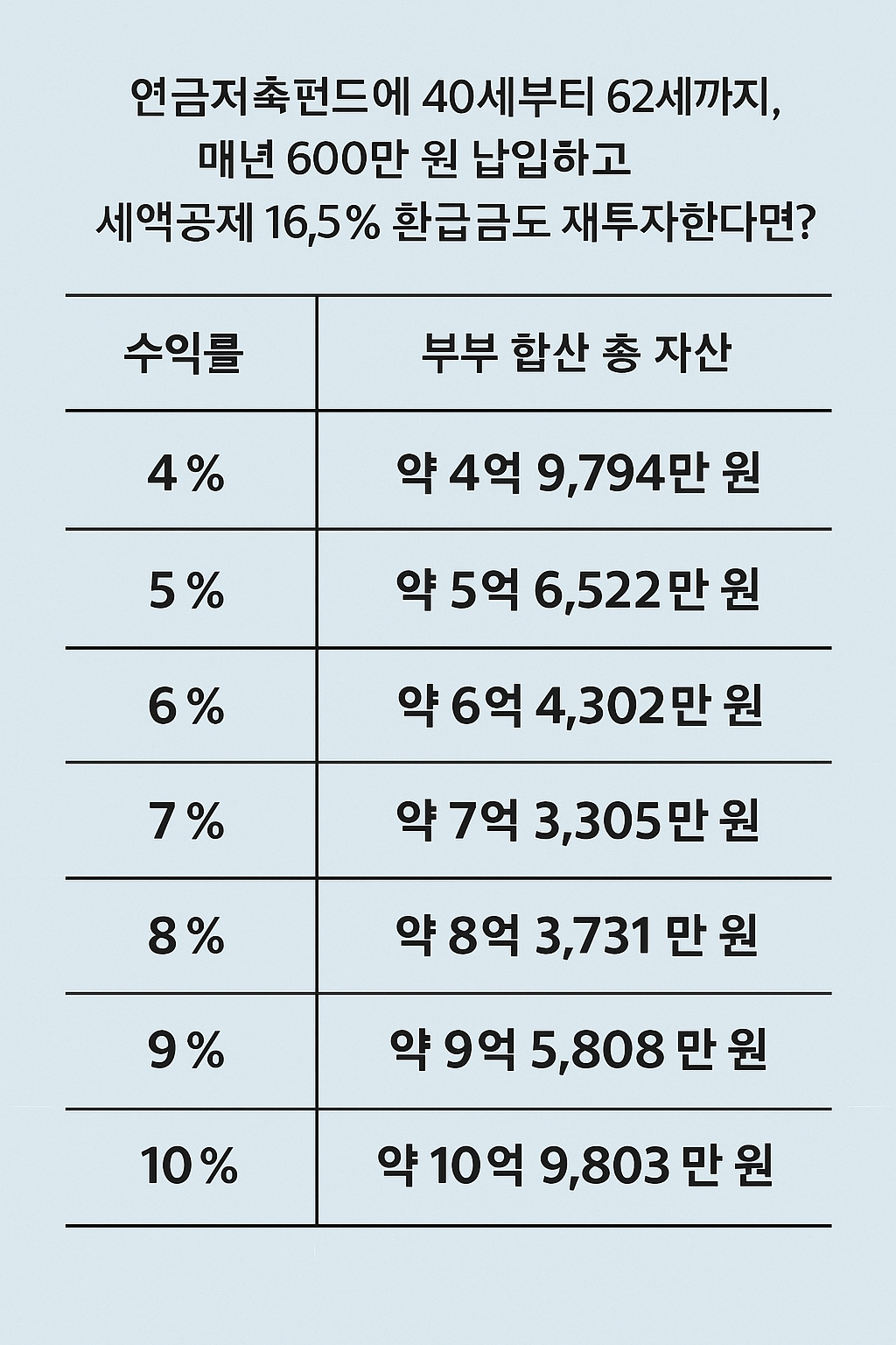 수익률 4%와 6%는 분명 큰 차이가 있지만, 더 큰 차이는 '세액공제를 재투자했는가'와 '얼마나 꾸준히 납입했는가'에 달려 있다.