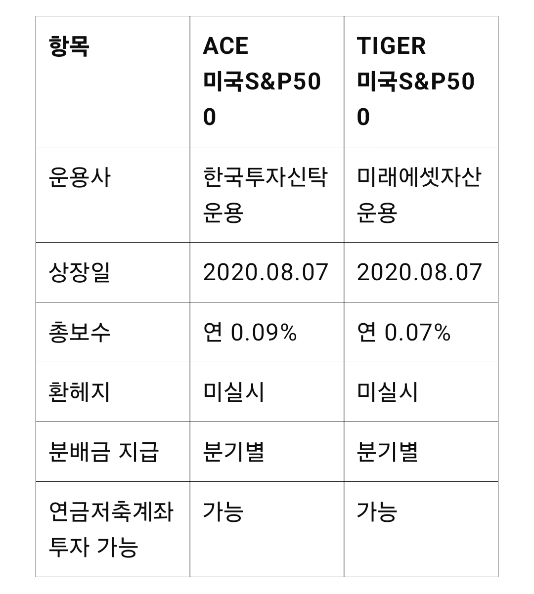 이 중에서 연금저축펀드에서 투자할 수 있는 ETF 중에서, 특히 많은 투자자들이 관심을 갖는 ACE 미국S&P500과 TIGER 미국S&P500에 대해 자세히 알아보자.  ETF 모두 국내에서 연금저축계좌를 통해 투자할 수 있으며, S&P500 지수를 추종하는 지수다.