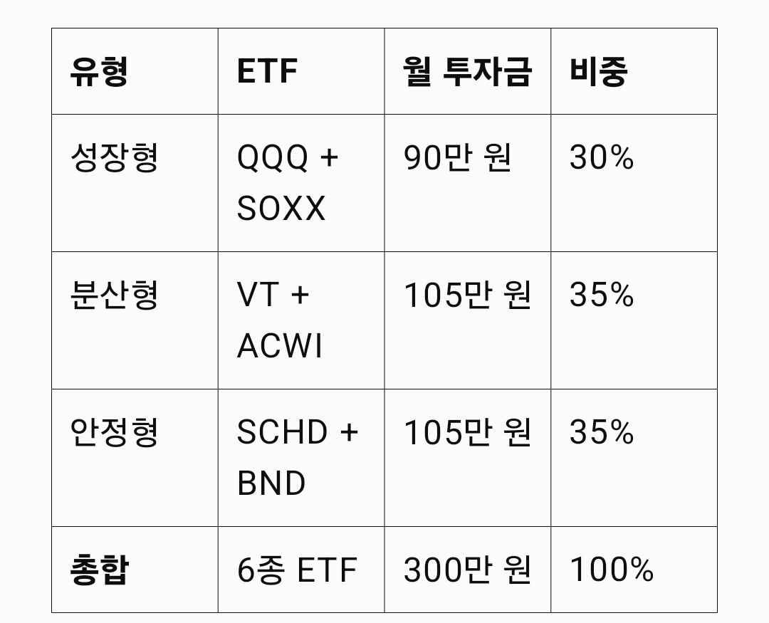 안정형: SCHD, BND → 배당과 채권 중심의 ETF. 멘탈을 지켜주는 역할.