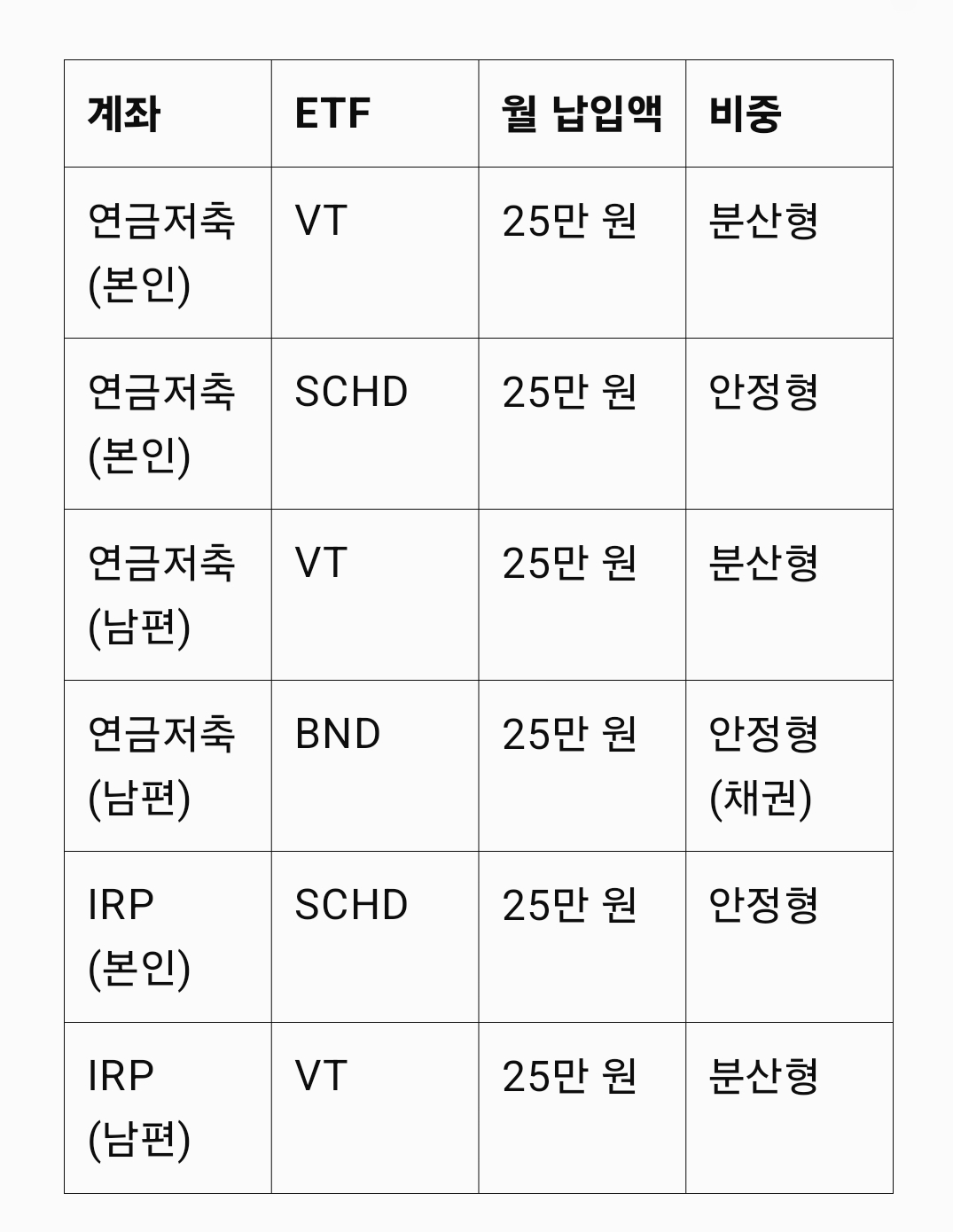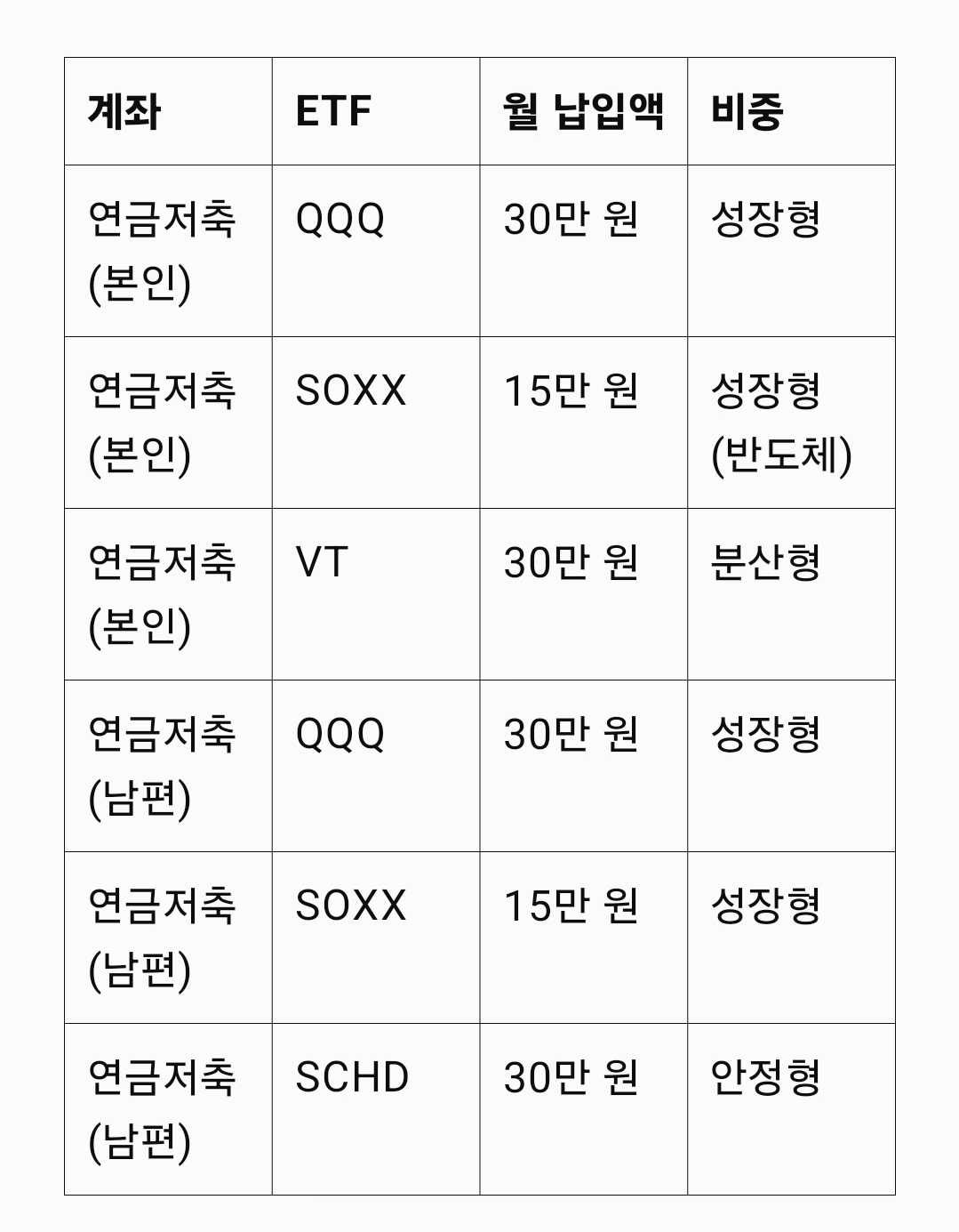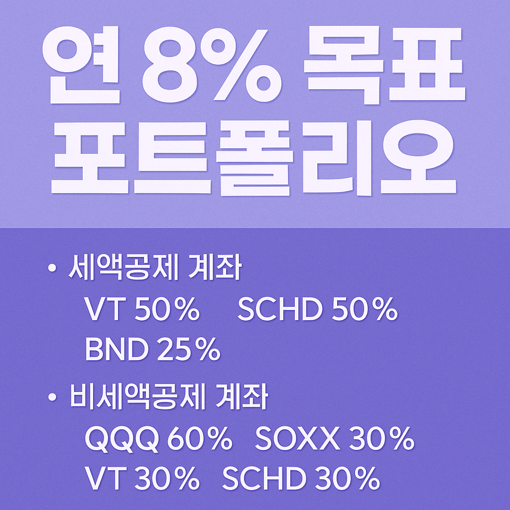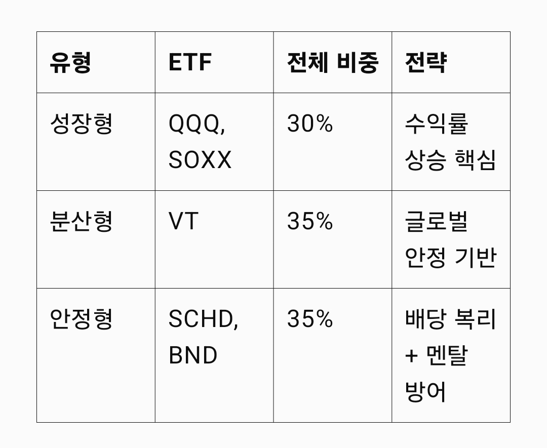 ETF는 많지만, 중요한 건 ‘내 계좌에서 어떤 ETF를 어떤 비중으로 담느냐’예요. 저는 VT + QQQ + SCHD 조합을 기본으로, SOXX와 BND를 일부 추가하는 방식으로 포트폴리오를 최적화했습니다.